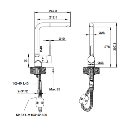 • Chiều cao vòi 307mm