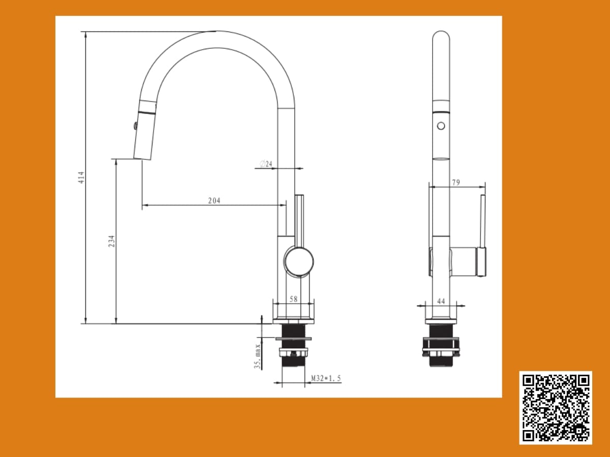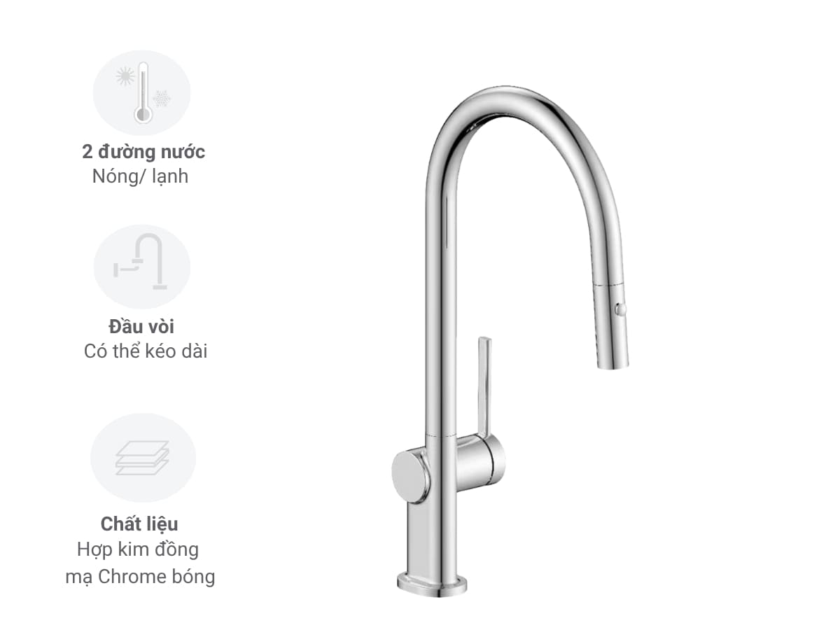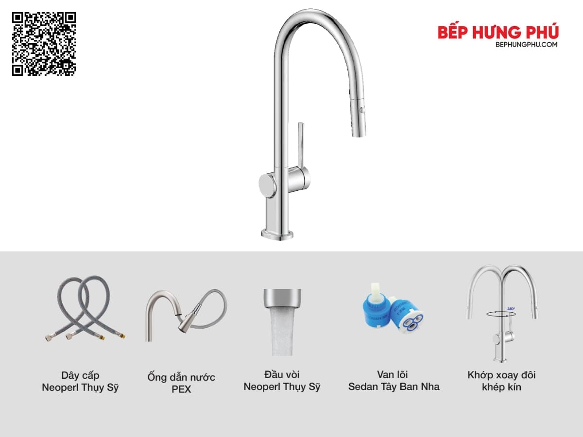 • Kiểu dáng vòi: Là vòi rửa bát dây rút, đầu vòi cong, tay điều khiển công thái học.