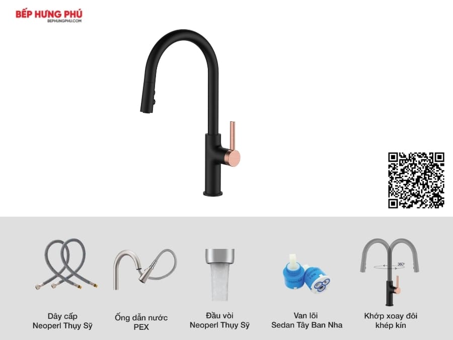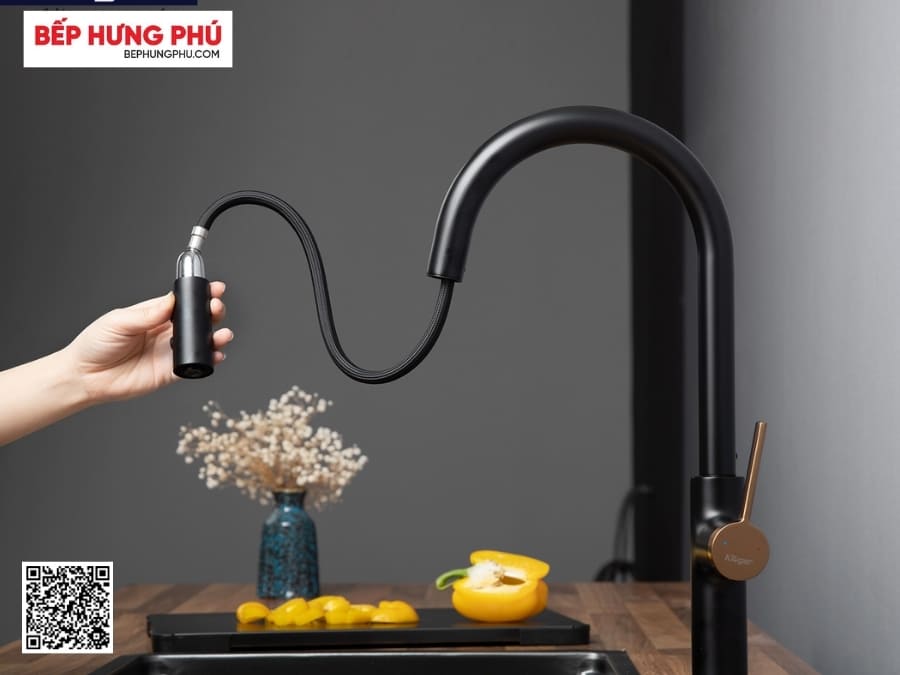 - Kiểu dáng vòi: Là vòi rửa bát dây rút, đầu vòi cong, tay điều khiển thiết kế công thái học.