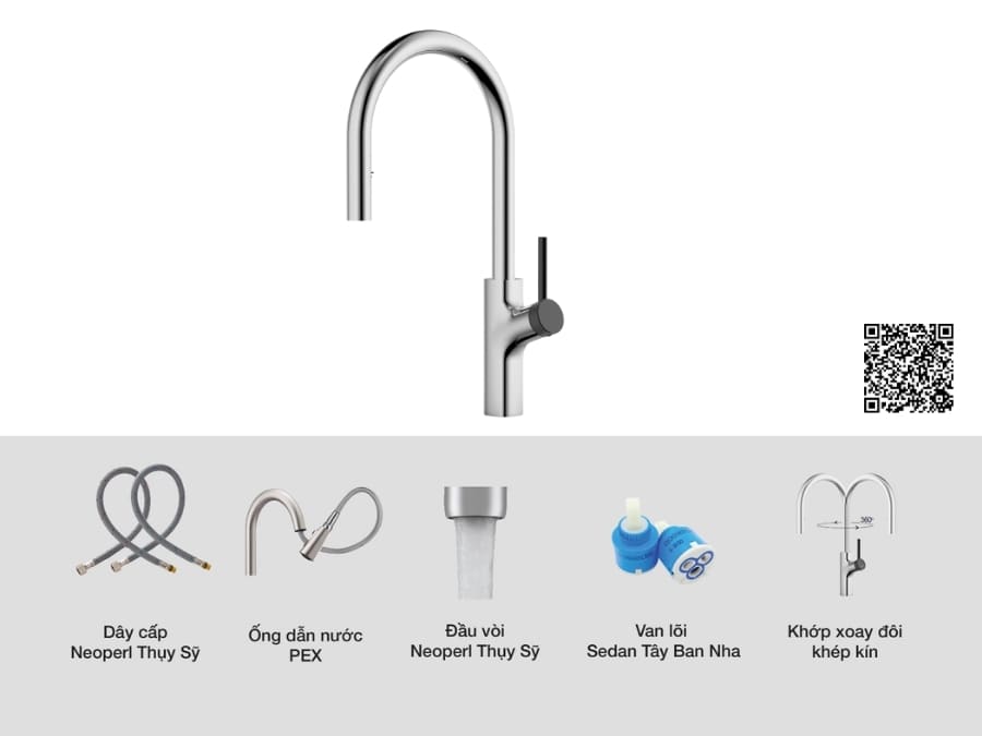 - Sử dụng linh kiện cao cấp: Van lõi Sedal (Tây Ban Nha), Dây cấp và bộ định hướng dòng chảy Neoperl (Thụy Sỹ), ống dẫn nước PEX đạt chứng nhận NSF.