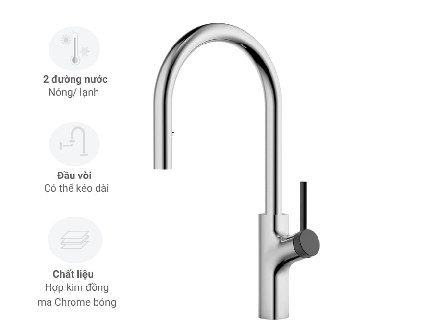 - Kiểu dáng vòi: Là vòi rửa bát dây rút, đầu vòi cong, tay điều khiển thiết kế công thái học.