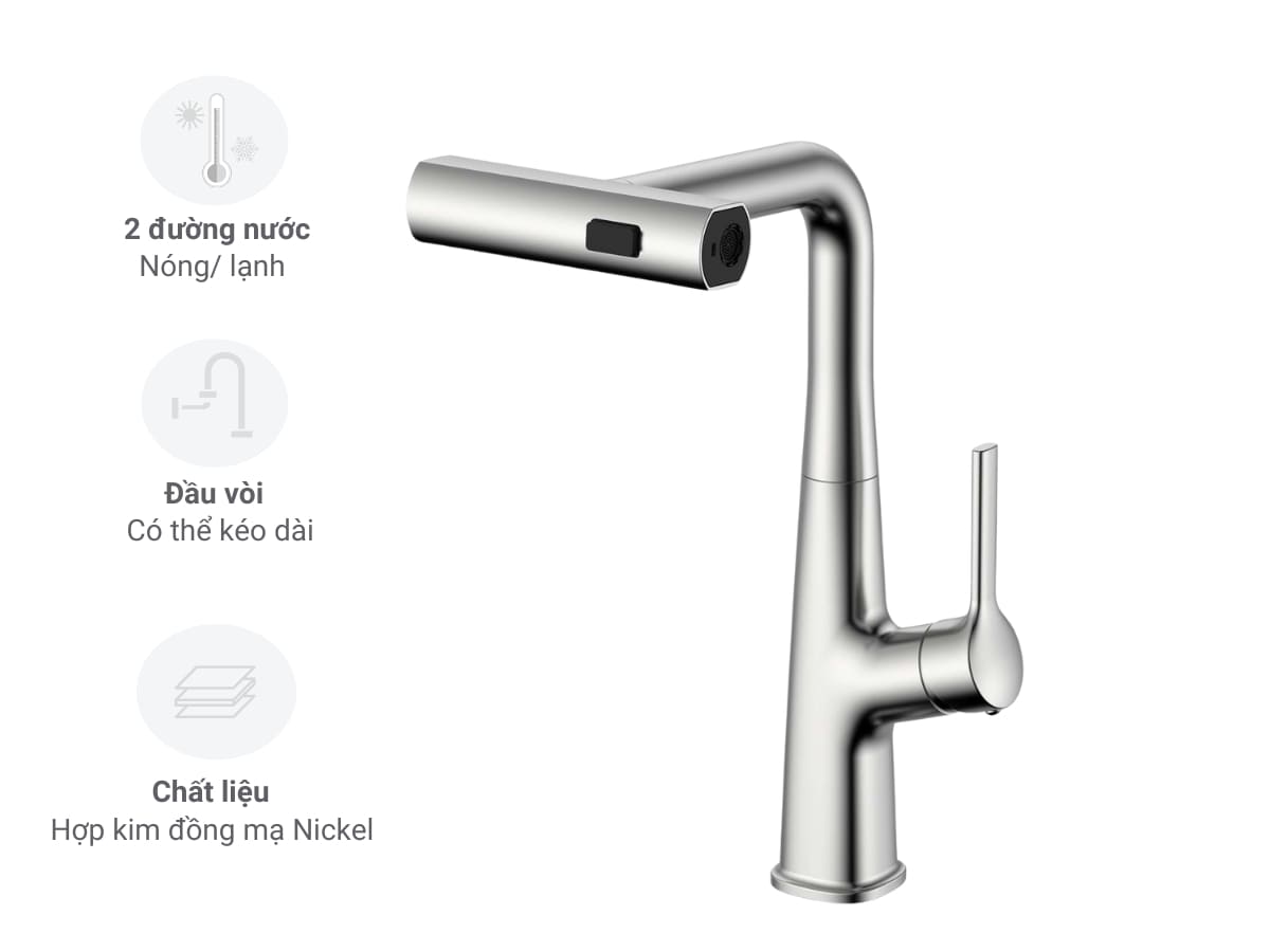 • Chất liệu: Toàn bộ thân vòi làm từ hợp kim đồng mạ Nickel