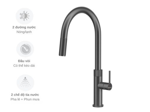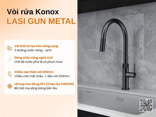 Vòi rửa Konox Lasi Gun Metal với thiết kế tinh tế, sang trọng cho không gian bếp hiện đại