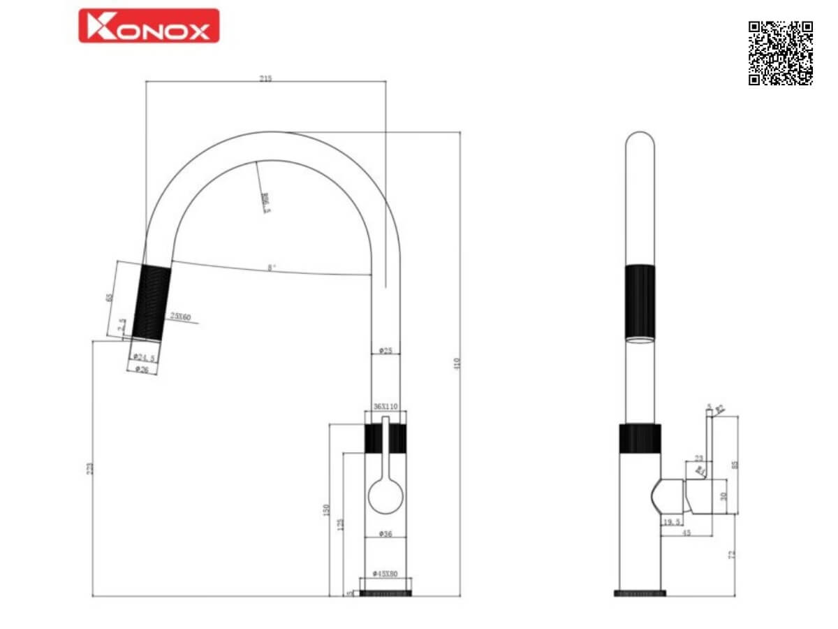 Kích thước của Vòi rửa Konox Lasi Gun Metal