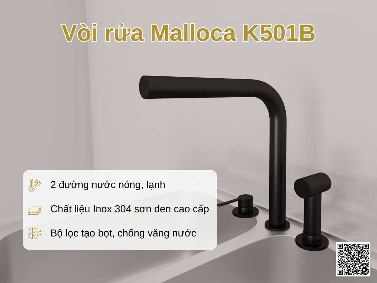 Vòi rửa Malloca K501B làm từ Inox 304 cao cấp, bền bỉ và dễ vệ sinh. Thiết kế hiện đại, tích hợp 2 đường nước nóng lạnh cùng bộ lọc tạo bọt giúp chống văng nước, mang lại trải nghiệm rửa tiện lợi, an toàn và tiết kiệm cho mọi gian bếp.