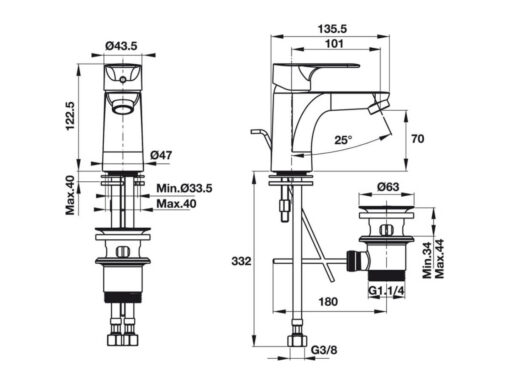 • Khoảng cách từ đầu vòi đến chậu/mặt bàn 70mm, tối ưu cho không gian nhỏ gọn.