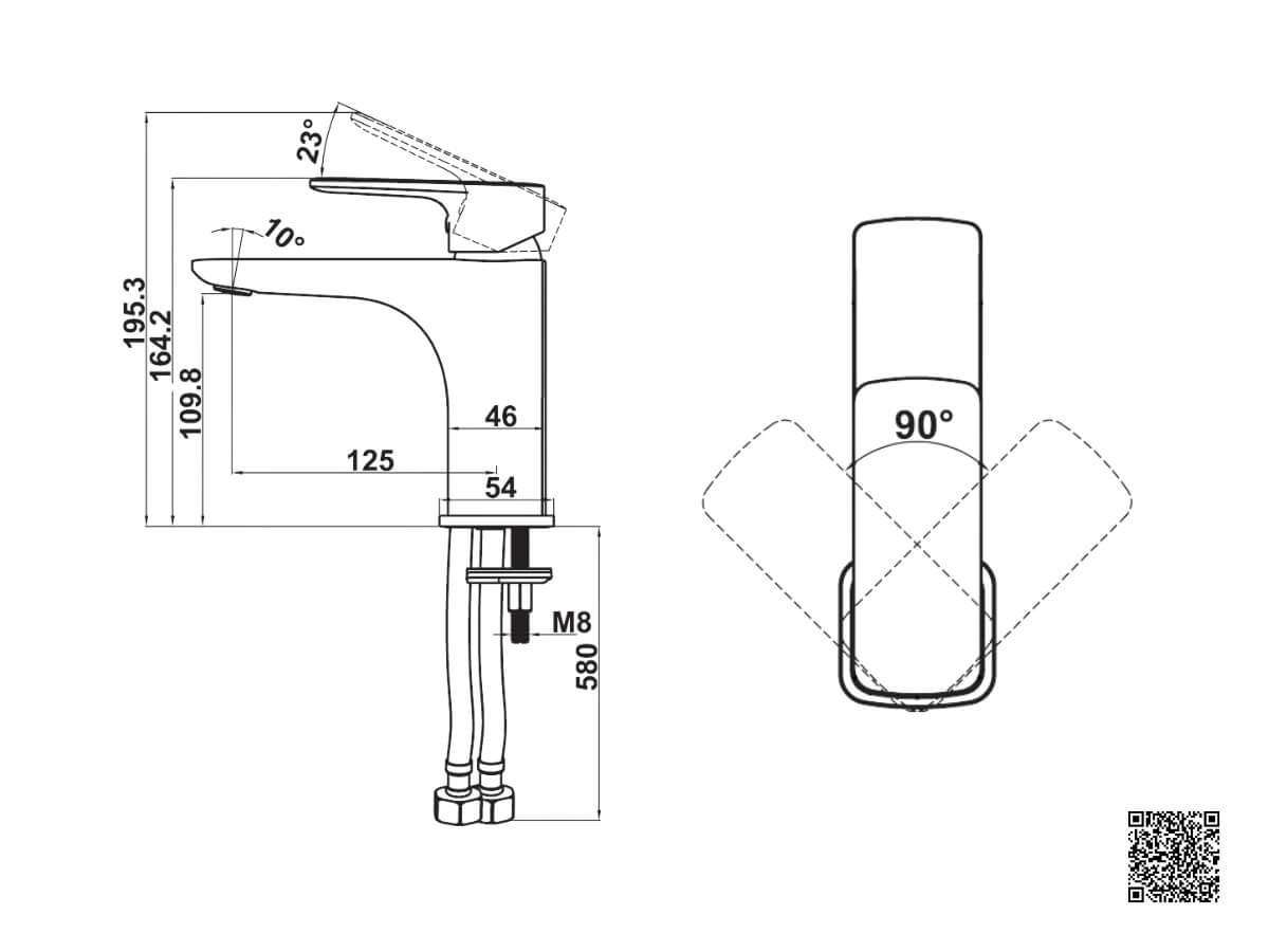 • Thiết kế nhỏ gọn với chiều cao tổng thể 164.2mm và khoảng cách từ đầu vòi đến mặt bàn 109.8mm, phù hợp với nhiều loại chậu rửa khác nhau.