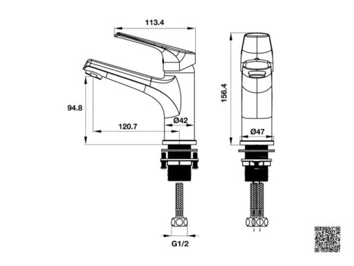 - Thiết kế kích thước tiêu chuẩn: chiều cao tổng thể 156.4 mm, khoảng cách giữa dòng nước và thân vòi 120.7 mm, cùng khoảng cách từ đầu vòi đến mặt bàn/chậu 94.8 mm, mang đến sự cân đối và tiện lợi trong quá trình sử dụng.